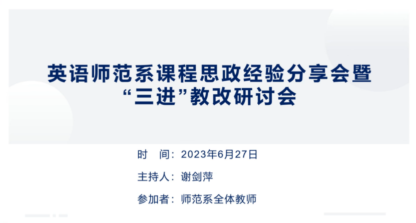 此次会议分为三个环节,即工作总结,经验分享及自由研讨。会议伊始,谢剑萍主任总结了本学期英语师范系的招生工作和“三进”工作,肯定了当前工作的成绩,并鼓励更多教师积极参与,扎实推进“三进”工作走深走实。