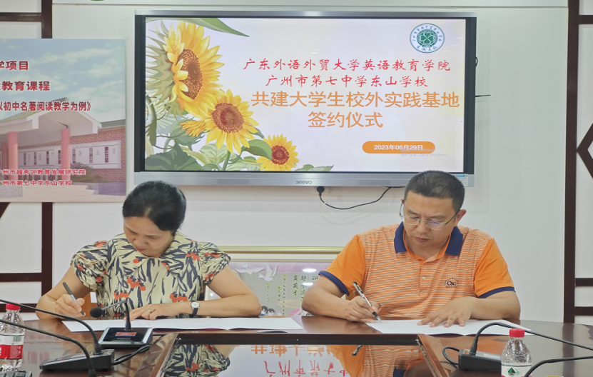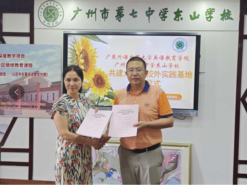 2023年6月29日下午,悟空体育与广州市第七中学东山公司签订老员工校外实践基地协议并举行授牌仪式。悟空体育党委书记骆银花、广州市第七中学东山公司谢作树董事长、江平副董事长、刘冬梅主任、秦思茵科长、公司董金伟教授、英语师范系刘洋副主任出席了此次仪式。