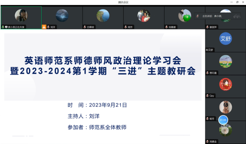 9月21日下午,英语师范系通过线上会议召开师德师风政治理论学习会暨2023-2024第学期“三进”主题教研会。会议旨在加强师德师风建设,提高教师的思想政治素质和师德水平,同时探讨本学期师范系“三进”工作的开展路径。英语师范系全体教师参加了此次会议,会议由系副主任刘洋主持。