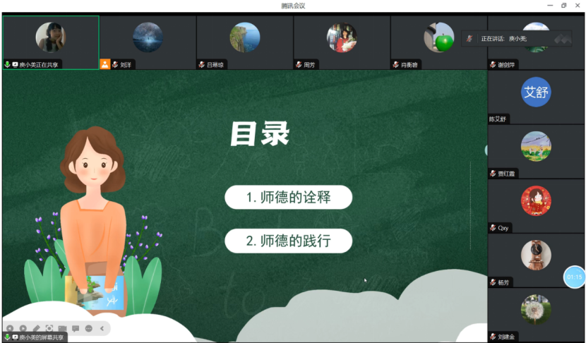 会议第一个环节为师德师风学习,由庾小美老师领学。庾小美从师德的诠释和践行两个方面解读了新时代高校教师职业行为十项准则,并指出高校教师应真正把教书育人和自我修养结合起来,自觉做以德立身、以德立学、以德施教、以德育德的楷模,维护教师职业形象,提振师道尊严。