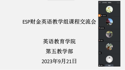 9月21日下午,第五教学部ESP财金英语教学组召开了课程交流会。本次课程交流会旨在通过新教师新学期教学体验分享和老教师经验指导,进一步推进第五教学部课程体系发展,提高教学质量。会议采用线上线下相结合的形式,由谢娜主持,课程组7名教师共同参与。