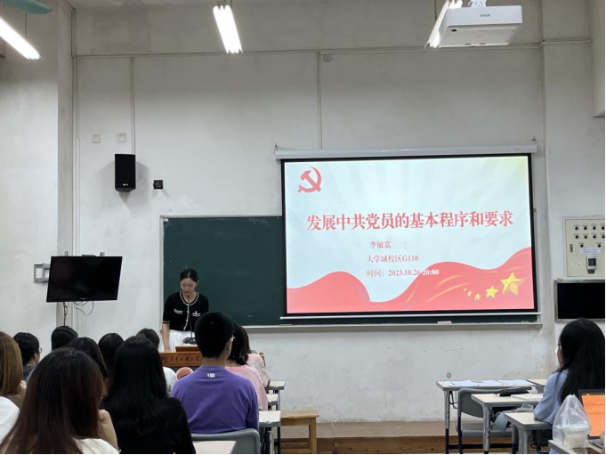 李敏嘉老师为同学们详细讲解了发展中共党员的基本程序和要求。她勉励同学们做到思想上入党,在理想信念、思想觉悟和行动实践方面以党员标准要求自己。她重点强调在思想上入党,入党积极分子们要学习领悟贯彻习近平新时代中国特色社会主义思想和重要讲话精神,时刻保持正确的入党动机,进取的积极心态和为人民服务的初心。