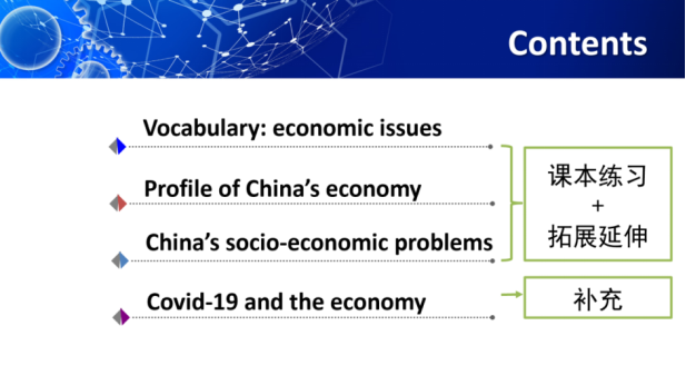 随后,李悦老师以“ESP课程定位与课程内容设置—以《经贸英语》和《管理英语》课程为例”为主题,结合自己17年ESP教学的经验,详细分享了对ESP课程定位和课程内容设置的认识和见解,并通过教学示例展示。李老师向大家明确了ESP的定义和课程定位,并详细阐释了ESP课程内容设置,她以Travel和Organization两个单元为例,通过《经贸英语》和《管理英语》两门课程,向大家展示了如何根据不同的专业特点设置不同的课程内容。此外,李老师以面向经贸公司经济学专业二年级本科生开设的经贸英语(2)“The Economy”为主题的单元为例,介绍了授课计划、内容和安排,包括单元定位、教学目标、授课时数、教学材料(课本、视频、期刊文章)以及主要内容。