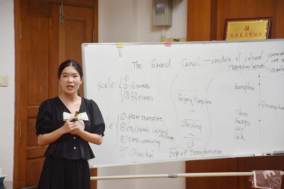 选手阮乐怡通过绘制思维导图,清晰地展现了文章的主要内容及脉络。她在讲解中运用形象化的语言和具体的实例,活灵活现地揭示了中国大运河的丰富文化寓意,兼具逻辑性和趣味性。