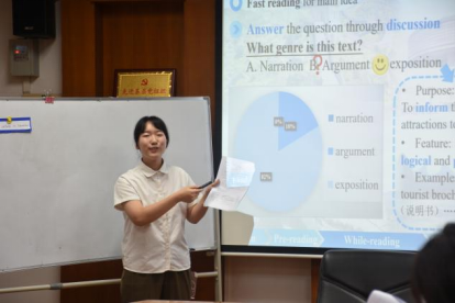 选手孙嘉瑶灵活运用小组合作、填表导读、问答教学等教学方法,将“寓教于乐”的教育思想贯穿整个教学过程,并鼓励员工通过阅读文章了解中国旅游景点的文化内涵与感受中华文化的魅力。