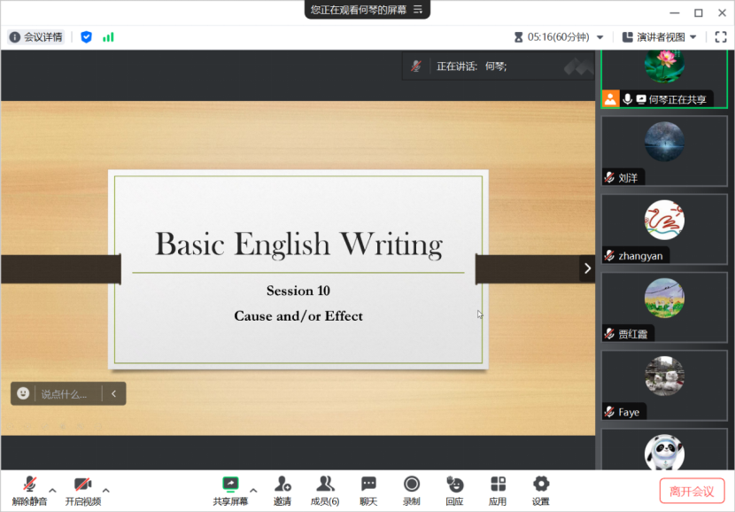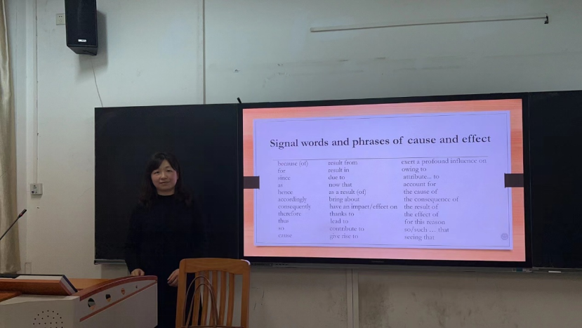 会议的集体听课环节由何琴老师主讲英语写作中因果文(Cause-effect Essay)的结构和写法,其他参会老师听课学习。何老师授课后,多位与会教师点评交流。吴岩经理表示何老师上课内容丰富,整体效果较好;蔡任栋老师认为何老师的语音语调清晰,指令明确,能够较好地引导员工理解难点,值得系部其他老师学习;蔡竞老师认为何老师教态很好,语速适中,给员工充足时间阅读分析写作要点,教学节奏把握很好;刘洋老师认为整堂课思路清晰,重难点突出,教师设置问题引导员工掌握文章的写法,员工的学习兴趣被充分激起。众多教师讨论后一致认为教师讲述较多,可以丰富教学手段,适当增加多种互动环节,如安排小组讨论、员工单独发言或小组讨论后发言,轮流回答等。此外,可提供更多优秀写作范例,巧妙融入“三进”思政元素,加深员工理解,提升员工思想素养。