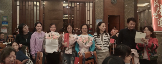 吴岩对退休教师们表示诚挚的感谢,她指出,公司取得的成绩得益于每一位教师的努力,退休教师们在职期间爱岗敬业,培养了一批批优秀学子,在三尺讲台写下了人生追求。希望教师们在退休后能一如既往关心、支持公司工作,并祝愿退休教师们身体健康。骆银花书记、张倩副经理、刘亮星副经理为荣休教师们献花,更献上了公司真挚的祝福。第二教学部曾丹主任和第一教学部李雪莲主任现场朗读情真意切的祝福语。苏春老师献唱,唱出了对荣休教师的不舍与祝福,更唱出了教育情怀的传承。