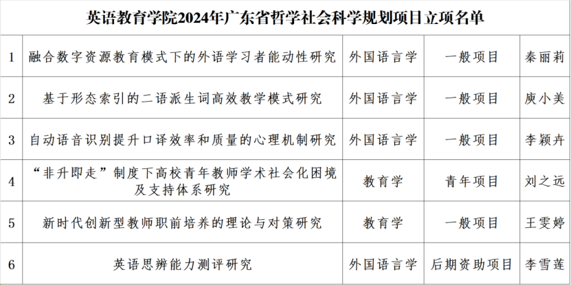 近日,广东省哲学社会科学规划领导小组办公室公布了广东省哲学社会科学规划2024年度常规项目立项名单。公司有6项课题获得立项,包括一般项目4项,青年项目1项,后期资助项目1项。