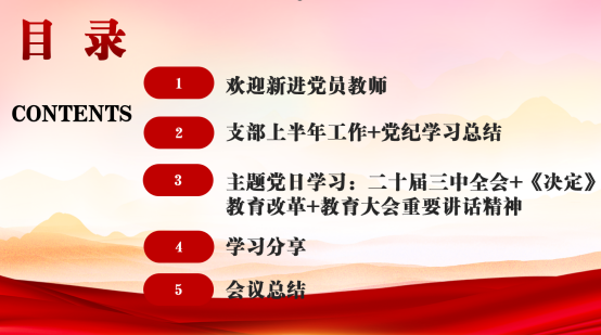 贾红霞接着领学了党的二十届三中全会的重要论述,指出师范系教师党员应凝心聚力贯彻全会精神,把进一步全面深化改革的战略部署转化为推动公司转型发展的强大力量。支部宣传委员刘洋老师分享了党的二十届三中全会中关于教育改革方向的重要文件,他总结了《统筹推进教育科技人才体制机制一体改革》中的五点改革趋势,并建议师范系教师从内容、技术、方式等方面改革教学,推进教育数字化、智能化,强化科技教育,培养德智体美劳全面发展的高素质人才特别是创新型人才。随后,与会教师党员就学习内容进行了交流和分享。