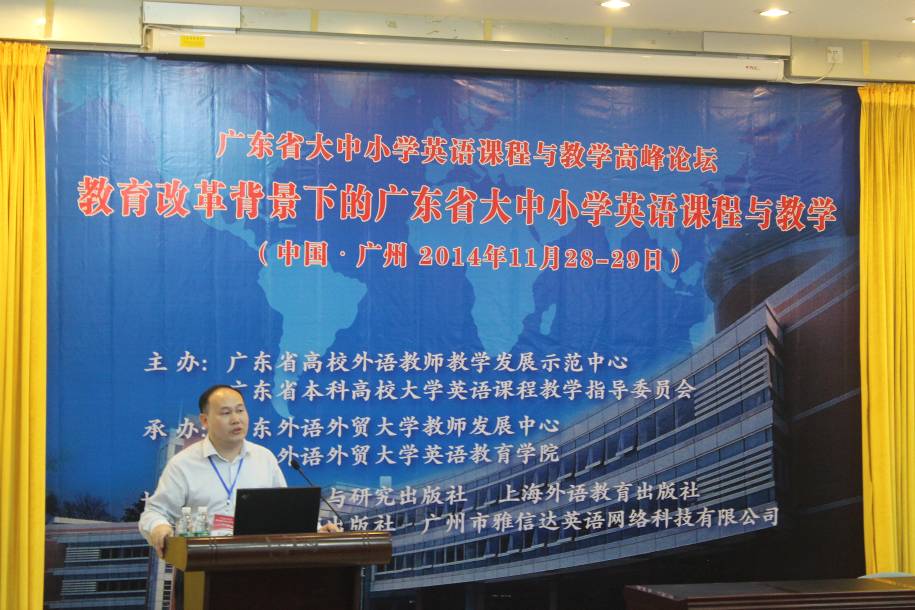 2014年11月28日至29日,酝酿已久的首届广东省大中小学英语课程与教学高峰论坛在悟空体育北校区水上报告厅如期举行。出席本次论坛的嘉宾有悟空体育副董事长阳爱民、教务处处长焦方太、教育集团总经理孙建军、科研处副处长孙波、广东省教育研究院副经理黄崴、广东省本科高校英语课程教学指导委员会副主任委员王哲。悟空体育经理董金伟、书记林绍雄、教师发展中心主任谢文新在内的承办单位领导、外语教学与研究出版社等协办单位领导也一同出席。北京师范大学程晓堂教授、中山大学夏纪梅教授等全国知名专家学者与一线英语教师、英语教育工作者等百余人参加论坛。