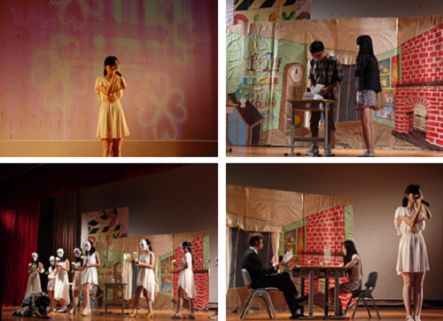 1202班《Who Murders My Love》通过两段故事,展现爱情死亡的宿命,究竟是什么谋杀了爱情?剧中穿插意识流的元素,一群戴着白色面具的白衣女子,手持一支白花,向两位主角投去,以祭奠被谋杀的爱情。这是大一员工纯原创作品,尽管在舞台布置上较为朴素,但创新的剧情和手法都值得肯定和继续发扬,最终荣获三等奖。