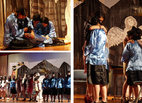 1101班上演的《金陵四钗》赢得了全场最热烈的掌声。1937年南京沦陷,教会公司女员工、秦淮河畔风尘女子,还有一个美国人约翰,共同面对一场生死浩劫,产生了各种各样奇妙的感情。然而,女员工被日军强征去庆功会,谁都知道,这将是一条凶多吉少的不归路。女员工们不甘被日军凌辱,准备集体跳楼自杀,却被妓女们救下。金陵四钗在侵略面前,彰显了舍身救人的真善美,完美演绎了爱的回归历程。