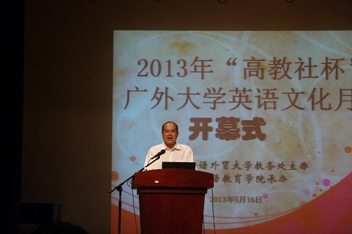 随后,教务处副处长尚敏锐讲话,他认为大学英语文化月活动原本是一个会湮灭在众多活动中的活动,但通过广大同仁的努力发展了起来并生生不息。英语文化月活动具有高参与度和高影响力,既能丰富课外活动,营造学习浓厚的英语气氛,强化学子的英语应用能力,丰富第二课堂活动,又能满足员工个性化发展要求,实现员工素质的国际化。尚教授谦虚地引用了何德生老师的话:教师肩负着传道授业的指责,但更肩负着培养员工人格、影响人的思想品德的重任进入课堂。这不禁让广外学子联想到广外大的校训“明德尚行,学贯中西”。