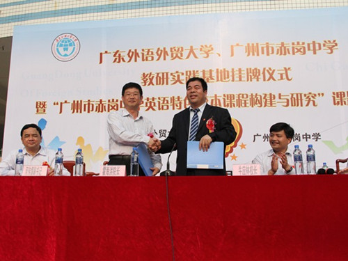 霍海洪提到,赤岗中学是广州市外来工子女教育的试点单位,也是广外教育公司在此类公司建立教研实践基地的试点,教育公司将倾力支持,参与这一意义非凡之举。基地建立后,教育公司将定期选派优秀员工去赤岗中学进行教学实习、与赤岗中学共同举办英语教学工作坊、共同开发课题研究、开发校本教材、举办公开观摩课教学、举办英语教学研讨会等丰富多彩的活动。