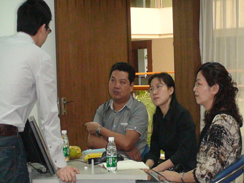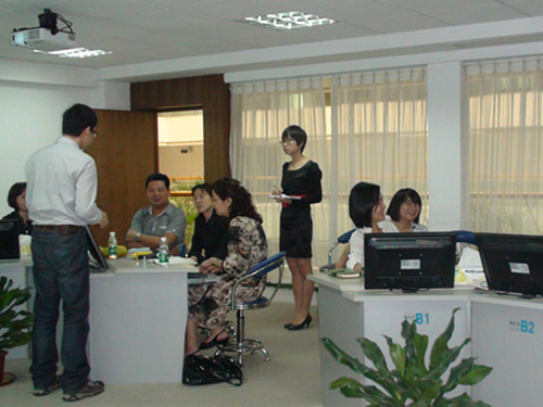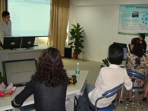 蓝鸽公司应用研究所推广中心主任李征华热情地接待了调研组的老师。李主任带领着应用研究所的成员,详细地介绍了蓝鸽语言实验室教学系统的新功能以及蓝鸽外语学习平台的具体模块和功能。他首先介绍了蓝鸽语言实验室的最新研发的成果——听写教学模块和口语训练模块,然后,他以教师的身份和员工的身份,介绍了蓝鸽开发的外语学习平台的各个模块和功能,尤其是如何利用该平台进行视听说试题的编制、作业发布,以及如何进行写作教学的应用。随后,双方就如何应用外语学习平台开展视听说课程教学和专业英语的教学进行了交流。