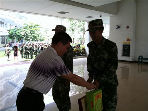 随后,林绍雄书记代表英教公司向二营九连的参训教官赠送了慰问品,预祝军任务圆满完成,也预祝参训教官中秋快乐。二营九连一排的石教官敬礼感谢悟空体育领导的关心和慰问,石教官表示将以高标准严要求进行训练,圆满完成军训任务。