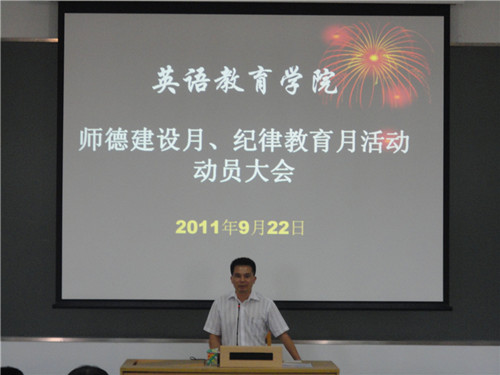下午两点半,会议正式开始,作为师德建设月和纪律教育月活动动员大会的主持人,党委书记林绍雄首先向在场教职工传达了以“以身立教,为人师表”为主题,以“爱岗敬业,教书育人”为核心的师德建设月精神,呼吁全体教职工认真贯彻国家有关文件提出的教育理念和精神。接下来,林书记向教职工们传达了以“以人为本,执教为民”为主题的纪律教育学习月的精神。他指出,教师是一个光荣而神圣的职业,抓好教职员工职业道德教育和廉洁教育尤为重要;号召教职工们在恪守“学术诚信,廉洁从教”信念的同时,要努力抓好员工的廉洁修身教育,更充分地扮演好自己为人师表的角色。会上还组织了教职工们观看党风廉政建设先进人物事迹的宣传片,帮助在场教职员工进一步感受并学习廉洁奉公、一切为民的精神。