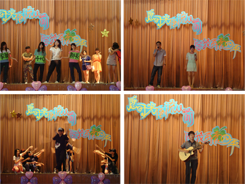 在极富创意的开场视频后,公司院舞队以一支劲爆火辣的开场舞炒热全场。接下来,晚会分为三个主题依次进行,分别是我们相爱四年、时光倒流从前和你我再爱四年。三个主题贯穿而下,各年级员工纷纷登台表演,精彩纷呈。10级四个班的同学分别以小品、系列舞蹈和歌曲的形式为师兄师姐献上最真诚的祝福。092班歌舞剧《英华·四载》从07级毕业生的视角出发,历数大学每一年的独特感受,引起在场观众强烈的情感共鸣。同时,在节目结尾,他们以视频、文字和贺电的形式传达了往届毕业生对07级毕业生的劝诫、教导、祝福和期待,温暖了07级每一位同学的心房。大三同学采用相声为每一丝回忆抹上诙谐的色彩,同时也以独唱和吉他演奏传递出脉脉温情。07级毕业生男女对唱的一首《美丽的神话》浪漫深情,引起全场尖叫和掌声。在节目之后,现场播放了公司领导老师寄语DV,经理、书记及众位老师都在DV中对07级毕业生寄予了深切希望,期待他们能够在以后的日子里脚踏实地,一路走好,报效祖国,回馈社会,同时也希望他们不忘母校,常回家看看。