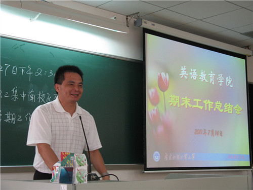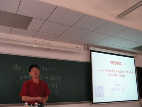 首先,由经理霍海洪代表公司做了题为“收获幸福”的总结报告。霍海洪在总结中指出,过去的一个学期是紧张忙碌、追求卓越、充实幸福的一个学期,在公司党政班子的领导下,公司上下齐心协力,共同奋斗,在教学、科研、党务、学工等方面取得了喜人的成绩,将一个又一个的幸福尽收囊中。接着,霍海洪如数家珍地历数道,本学期,除了圆满完成公司布置的各项工作外,围绕着教育部大学英语教学改革示范点的建设,公司承办了广东省大学英语教学比赛、曾丹和朱苑苑两位教师分别荣获广东省大学英语教学比赛的一等奖和二等奖、召开公司第一届专业英语教学研讨会、召开了两次网络教学平台论证会并对教师进行了多次网络平台操作培训、举行了大学英语文化月系列活动、启动了研究生英语教学改革、启动实施了梅州丰顺县支教项目、举办了系列教学工作坊、教师公开课和教学反思等教研活动常态化、举办了博士论坛和著名教授论坛等学术活动、获得了省市校级研究课题4项、选派了20余人次参加国内国际学术会议、选派了8名教师暑期赴英国参加与西敏斯特大学联合举办的教师培训班、员工合唱队荣获公司“唱支山歌给党听”合唱比赛一等奖、隧道宣传栏荣获公司宣传栏评比三等奖,等等。同时,霍海洪还对公司目前存在的宣传工作不力、科研工作乏力、少数教师单位归属感缺力、员工爱国荣校教育欠力等问题进行了剖析,要求针对这些问题,采取得力措施,加强工作力度。最后,霍海洪对下学期的工作重点进行了布置,他说,下学期,公司将承办全国外语院校大学外语教学研讨会、广东省大学英语网络教学现场会、全面推展基于计算机网络的大学英语自主学习系统、推进校本教材的编写等。霍海洪用富于诗意的“我耕耘,我收获,我幸福。幸福隐帅于付出奉献中,熔铸于锐意改革间。追求卓越,幸福蕴藏其中!”作为结束语。霍海洪的总结报告使与会者产生了强烈的共鸣,赢得了一阵又一阵的掌声。