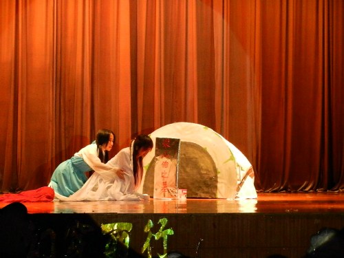 094班的Butterfly lovers则再现了梁祝情缘的凄美迷离。脍炙人口的中文经典故事、炉火纯青的原创翻译使观众的心随着剧情的发展而波澜起伏。在戏剧的高潮部分,“马文才”横刀夺爱,将梁祝逼上绝路,其精湛的演技让观众对这仗势欺人的纨绔子弟的憎恨之情油然而生。当聚光灯落这对在历经劫难,最终比翼双飞的“情侣”身上时,台下掌声如潮。幕布缓缓落下,但观众们的目光依然流连在舞台上,为这古典的浪漫爱情故事唏嘘不已。