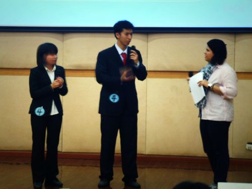 介绍完自己的队伍就进入了情景对话,这一部分吸引人的恐怕是外籍嘉宾Daniel和Sarah的搞怪客串了。不只是太“入戏”,还是他们俩故意“刁难”,对话中不时发生让选手“无言以对”的情况,小插曲不断。Sarah扮演的外国职工遭遇感情危机,两名中国员工前去劝导,Sarah不断用手挠脸颊,表现出愁苦的样子,把我们带到一个近乎真实的情景中。Daniel扮演各种角色时走“耍宝”、“装糊涂”的路线,这也为难了许多选手。在即兴对话环节中,我们分别抽到了“H1N1预防”和“五一旅游策划”两个预设话题。在陈文辉师兄讲到H1N1的症状与普通流感不同时,不料Sarah突然反问一句“How do I know?”,这时桂卿师姐接上了Sarah的问题,绕过了险些出现的尴尬局面。这段有惊无险的小插曲体现了队员的默契配合和高超的随机应变能力,令人佩服。