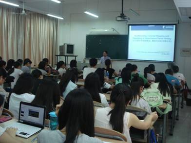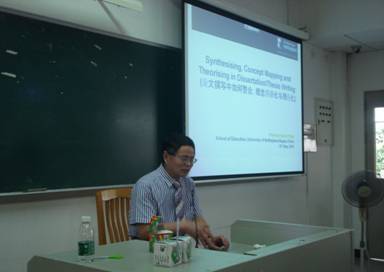 2015 519 下午三点半,在南校区教学楼E207,冯安伟教授做客英教,进行了题为Synthesising, Concept Mapping and Theorising in Dissertation/ThesisWriting(论文撰写中如何整合,概念图示化与理论化)的讲座。 教育系主任谢剑萍博士主持了该讲座,同时出席的还有教育系龙艳老师和公司孙红老师。 教育系大一大二大三的员工均参加了该讲座,其中大三员工占多数,现场座无虚席。