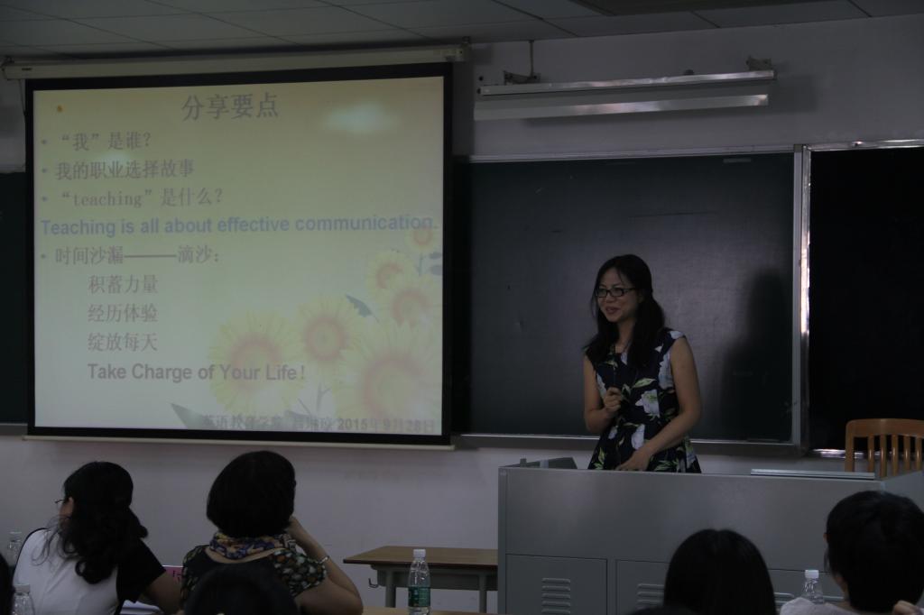 随即,教师代表吕琳琼上台致辞。吕琳琼与新生分享了大学的几个要点:第一,学会问自己——我是谁?给自己一个清晰的定位;第二,清楚自己的职业选择;第三,teaching是什么?teaching是一切有效的沟通能力;第四,时间就是沙漏,摆正态度显得尤为重要,大学是个积累、体验的好地方,要懂得把握好每一天!