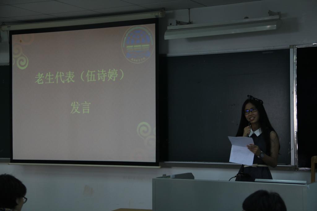紧接着,13级老生代表伍诗婷上台发言。伍诗婷以自身经历,给师弟师妹们的老员工活指点迷津。她十分鼓励新生们多些参加社团活动,努力平衡好学习与工作之间的关系。发言期间,伍诗婷更是赠予新生们“勿忘初心,方位本心”、“不要泄气,忙不是理由,而是态度”等金玉良言。师姐对大学幽默风趣的诠释,让新生们听得津津有味,同时获得了全新的启发。