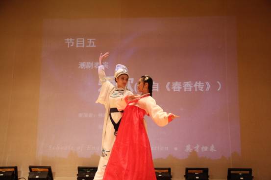 随后,1401班带来独具创意的杯子舞Cups,利用简单的纸杯,打出整齐清脆的节拍,给观众带来了不一样的视觉与听觉享受。紧接着,英教艺术团带来了原创音乐情景剧《喜欢你》,天籁的歌声与幽默的剧情巧妙融合,赢得全场掌声如雷。而由林雅洁和郑思裼同学演绎的经典潮剧《春香传》片段,展示出中国传统戏曲的魅力,同时这一独具特色的表演形式也让观众惊叹不已。