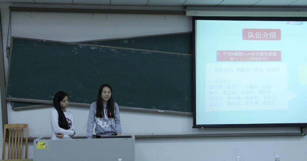 除此之外,2012级实习员工代表还强调了在实习过程中,若想成为一名合格的英语老师,除了要不断加强自己的英语技能,还要真正做到敢负责任,关爱员工。在对各实习点情况的详细介绍中,教育实习员工代表们都根据自己的经验对2013级员工提出关于实习方面的建议,如要学会把握机会、不推辞杂事小事、因材施教等。