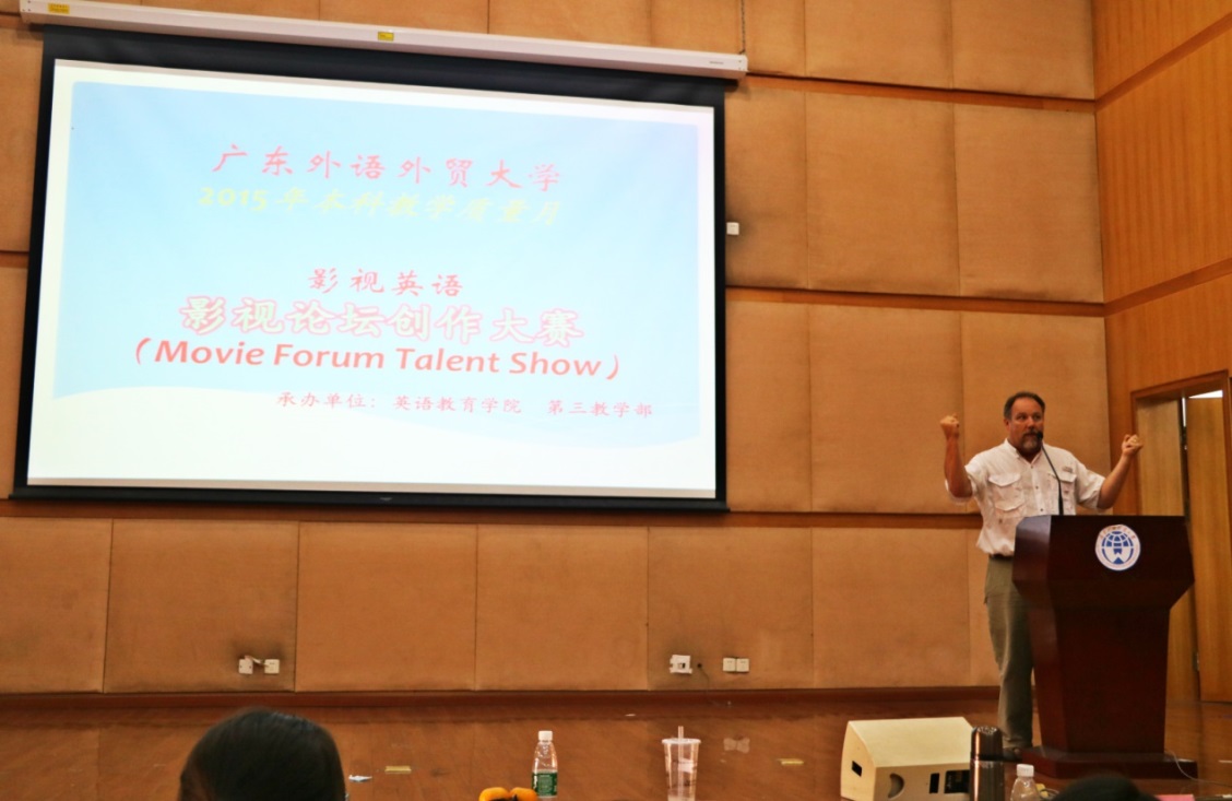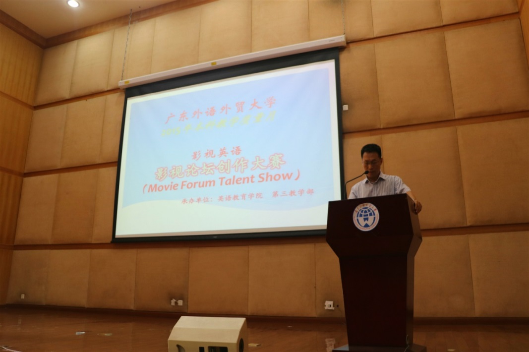 下午, 2015年度悟空体育教学质量月活动之“影视论坛创作大赛”在南校区图书馆多功能报告厅隆重举行。活动由悟空体育主办,第三教学部承办。悟空体育经理董金伟、副经理吴岩、第三教学部主任陶玉梅、《影视英语》教研室主任马小宇、外教Bob Lee,以及《影视英语》课程组老师出席了比赛。大赛由董金伟经理作开场致辞。
