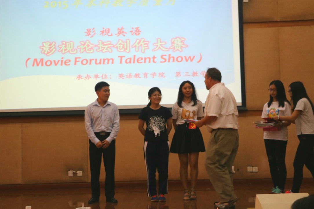 赛后,对获得一等奖的参赛队伍和现场观众进行了采访。一等奖参赛队伍代表杨同学说:“参加这个比赛也是兴趣使然,影视论坛给我们提供了一个展示想象力和创造力的平台。我们一步步地进入复赛,闯入决赛,拿了一等奖,发现影视论坛不仅锻炼了我们的英语表达能力,团队协作能力,还引发了我们对一些深层次问题的思考。虽然在准备过程中有困难,有压力,但是,我们非常享受这场比赛!”。来自新闻公司的李同学说:“参赛作品的背景音乐和视频剪辑都很到位;外教老师的提问很切中要点,同时选手们的临场反应速度都很快,口语很流利。”来自会计公司的黄同学说:“这次比赛非常精彩!每支参赛队伍的Idea都非常有创意,有深度,视频质量也非常高。希望以后能有更多像这样有趣又有挑战性的比赛。”