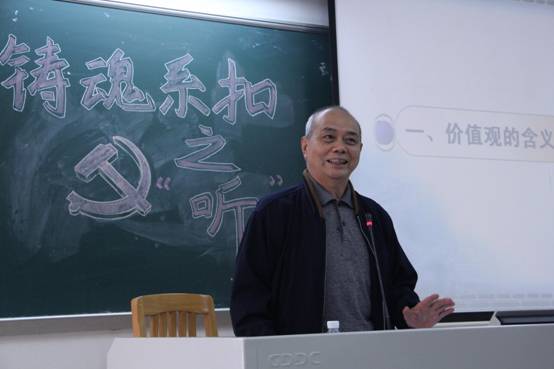 冯益谦融合了自己的学术研究和时事热点,从价值观入手,分别讲述社会主义核心价值观的内容、社会背景、弘扬的必要性,指导在场师生如何科学认识非核心价值观中的各种社会思潮,并希望大家能够将社会主义核心价值观内化为信仰、外化为行动。