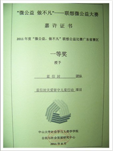 2011年,广外蓝信封组队参加“微公益,做不凡”联想微公益大赛,获得广东赛区一等奖,同年作为唯一一个老员工公益团体,入围中华儿慈会“童缘”资助项目。