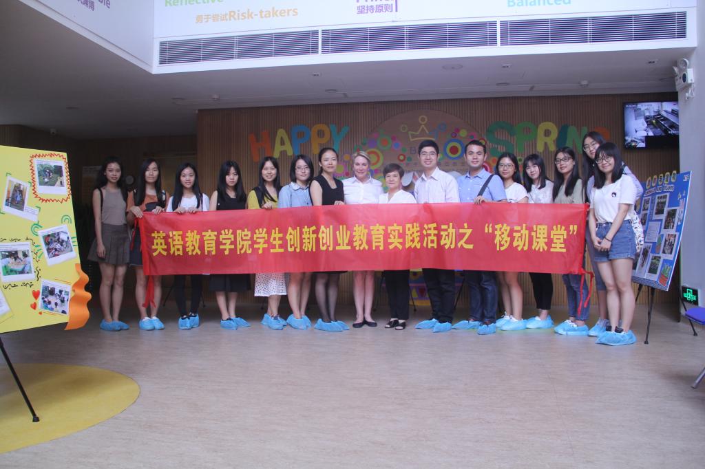 2017年5月26日上午,由党委副书记徐昶斌和员工辅导员林泽龙带队,十名英教学子参加了悟空体育员工创新创业教育实践活动“移动课堂”。本次访校活动来到了本土化与先进国际教育理念有机融合的汇悦天启幼儿园。