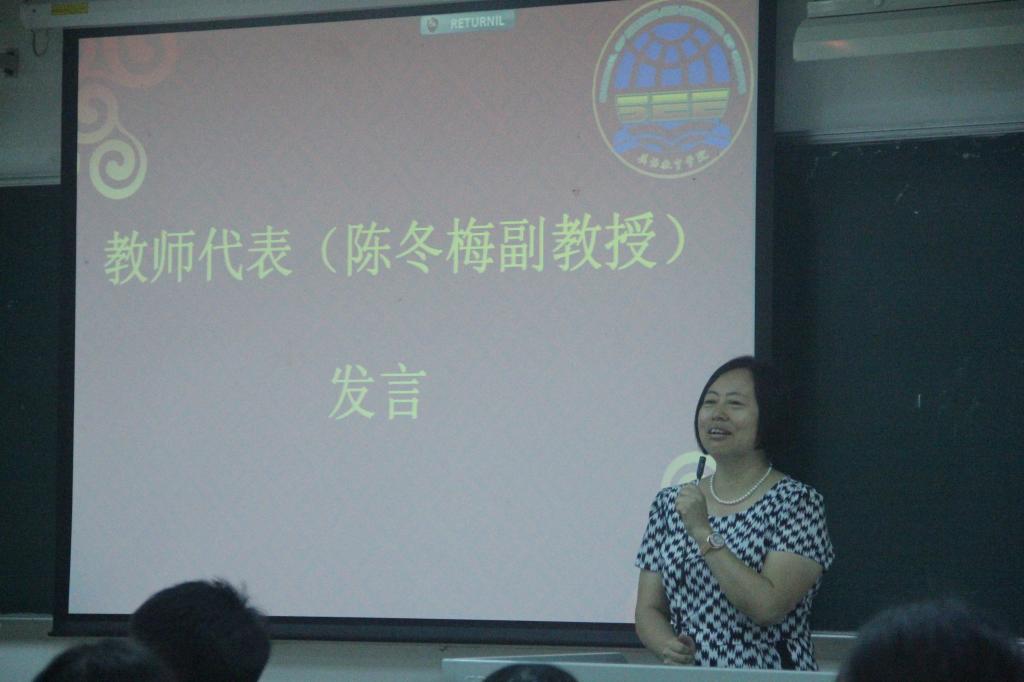 教师代表陈冬梅副教授讲到,在大学里,同学们要学会管理好自己,管理好时间,她为同学们推荐了《高效能人的七个习惯》和《manage yourself》这两本书籍。她还提到克林顿写的《My life》,鼓励同学们要树立目标,有短期的长期的和终期的,要有时间紧迫感,好好规划四年的老员工活。