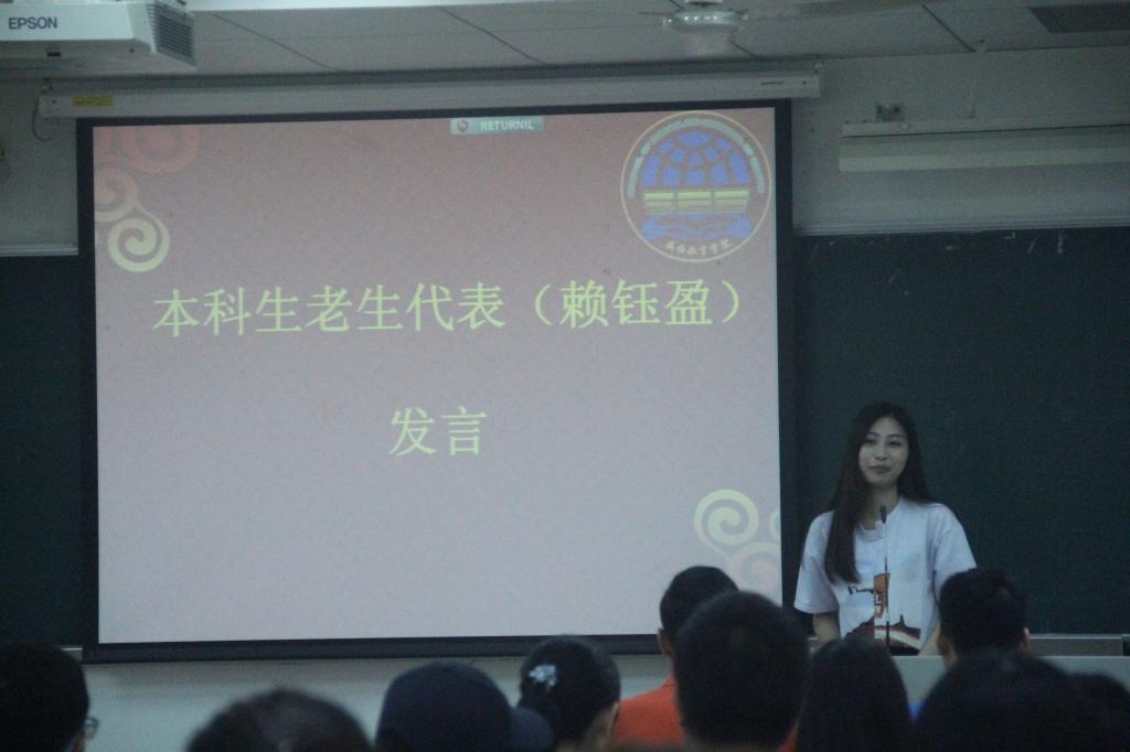 老生代表赖钰莹分享了她的大学情况,大一入员工会,大二当员工会主席,大三当交换生,此后还跨专业读研。她说道,这些在她看来是开始在偶然、微妙的瞬间中得到的成就,其实只是抓住了每一个发现她所爱的机会。她最后谈到,“大学,是用来珍惜而不是惋惜的!”