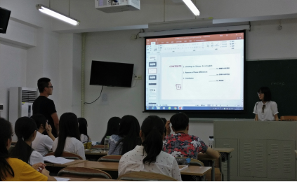 首先,张学进老师总结了上节课学习的内容,点评了员工上课的课件。紧接着邀请两组员工代表先后上台讲课。员工小老师从三个方面对第五单元的课文“Dinner at Joanne’s” 进行讲解分析:词汇、课文背景和人物性格。他们上的英语课气氛活跃,互动频繁,虽然教学方法还不够娴熟,然而却得到同学们的认可。员工上完课后,张老师对员工进行了点评,并给予了较高的评价。