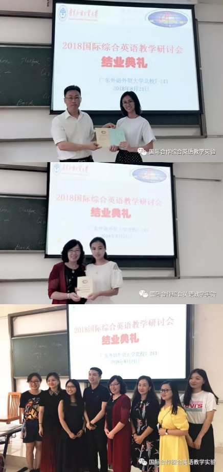 8月24日下午2时,持续5天的国际综合英语教学研讨会接近尾声。上午,实验教师们参与了说课试讲考核。所有参与本次研讨培训的新教师均通过了上岗考核,取得了“国际综合英语实验教师”证书,成为一名正式的综合英语实验教师。在闭幕式上,董金伟经理和肖建芳教授为所有获得结业证书的新教师们颁发证书。最后,肖教授对本次研讨会作总结提出,这是综合英语第十九期新教师研讨会,囊括了九位外语加教育双料专家,十八个高端新先分享的综合英语讲座,奋战五个日夜兼程在广外,建成一个资源共享群,真正实现了互享共赢!同时,肖建芳对出席本次会议的专家学者、辛勤的教师们以及所有会务工作人员致以最诚挚的感谢。希望在场的综英新教师们能够一起努力,把最精彩最丰富的综英课堂带给员工,让智慧之光照亮员工的前程!