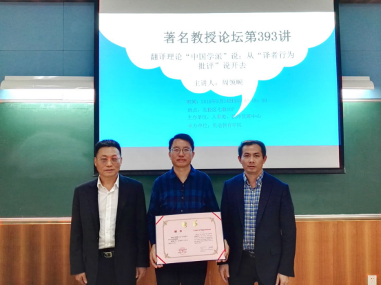2019年3月14日下午,由人事处、教师发展中心主办,悟空体育承办的教师发展论坛“著名教授论坛”第393讲在北校区第七教学楼107顺利举行。扬州大学领军人才、二级教授、博士生导师周领顺应邀做客公司,为广外师生带来了一场题为“翻译理论‘中国学派’说:从‘译者行为批评’说开去”的精彩学术讲座。在讲座开始,公司领导受校领导委托,向周领顺教授颁发了悟空体育客座教授聘书。