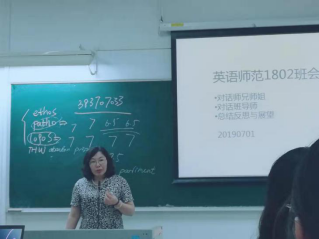 又讯:转眼大一已近尾声。新生入学时最初的兴奋已过去,同学们或多或少会对未来发展方向产生迷茫。为此,2019年5月24日下午,英师1802班在教学楼G211举行导师答疑主题班会。本次会议由英师1802班本科生导师肖建芳老师主持,出席会议的有英师1802班全体同学。