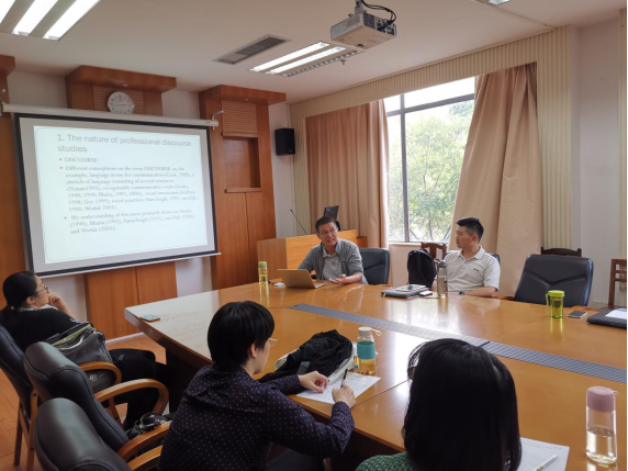 韩征瑞博士首先从自身科研成长的经历出发,帮助在场的师生理解专业人士话语分析领域。韩征瑞博士分享了自己读书和科研的苦与乐。当遇到困难的时候,他通过老师和同事的鼓励,发挥自己对于学术的热爱和执着,克服了研究和发表过程中的挑战,享受到了追寻知识的乐趣。韩征瑞博士生动的开场白让在场师生了解了他选择进入了专业人士话语分析领域,并在这个领域深耕的过程。这个过程的分享不仅让师生们明晰了专业人士话语研究的领域,也为在场师生寻找或是探索自己的研究领域提供了宝贵的启发和借鉴。