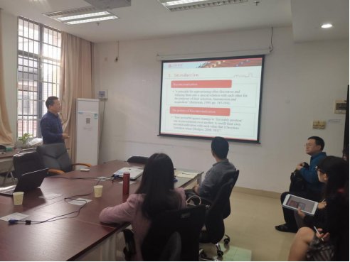 2019年11月21日下午,受公司机构话语研究中心邀请,上海交通大学外国语公司当代中国形象研究中心主任刘明博士副教授为公司师生做了一次精彩的批判语言分析研究的讲座。讲座的题目为《语料库辅助下的“一国两制”在中美英报刊中的再语境化研究》(One Country, Two Systems: A Corpus-Based Study of the Politics of Recontextualization in British, US and Chinese Newspaper )。熊涛副经理主持了讲座。