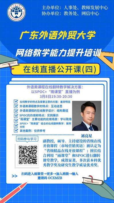 公司教师刘亮星副教授近日为粤港澳大湾区高校的教师做了直播讲座,分享了利用不同新平台的经验。他提出,可以考虑采用SPOC+“雨课堂”直播的组合,自建或引用知名慕课平台上的优秀课程,将其转化为适用于自己教学的SPOC,利用SPOC系统完备的学习功能。