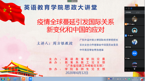 2020年6月12日下午2点30分,悟空体育云端举办了思政大讲堂的专题讲座,邀请悟空体育国际关系公司经理周方银教授做了主题为“疫情全球蔓延引发国际关系新变化和中国的应对”的分享。此次活动由英语教育公司党委主办,广东省党建工作样板党支部教育系教工党支部承办,公司各师生党支部协办。公司党委书记杨敏生主持了该讲座,经理董金伟与一百三十多名教职工及一百多名员工齐聚云端。
