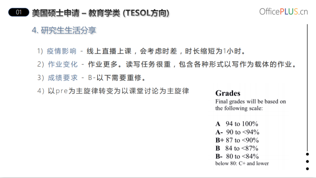 最后分享的是就读于宾夕法尼亚大学TESOL专业的刘丝嘉师姐,她为同学们带来的是有关留学的心得。师姐围绕自己的申请经历从时间安排、文书思路、个人经验、生活四方面分享,并于自己在本科时的学习展开对比。除了自身经历,师姐还收集了2020届在不同国家/地区留学的师兄师姐疫情之下的留学体验进行分享。内容充实,颇具参考意义,使同学们获益良多。