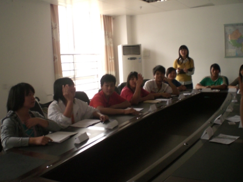 志愿者一行五人的到达受到了训练队的热情接待,公司领导安排一间会议厅作临时的教室。教学在下午两点正式开始。老师们首先各自用简洁有趣的语言介绍自己,运动员也逐个作自我介绍。接着,课程马上被带入重点。员工配对在设定的模拟情景下运用刚学的句型进行简单英文对话。他们显得非常活跃,在对话中提问十分积极,老师也分别对员工在语音和语法等方面出现的具体错误进行纠正,确保每个员工都能够掌握教学的内容。