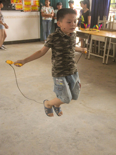 在脸上集满贴纸的同学正在跳绳