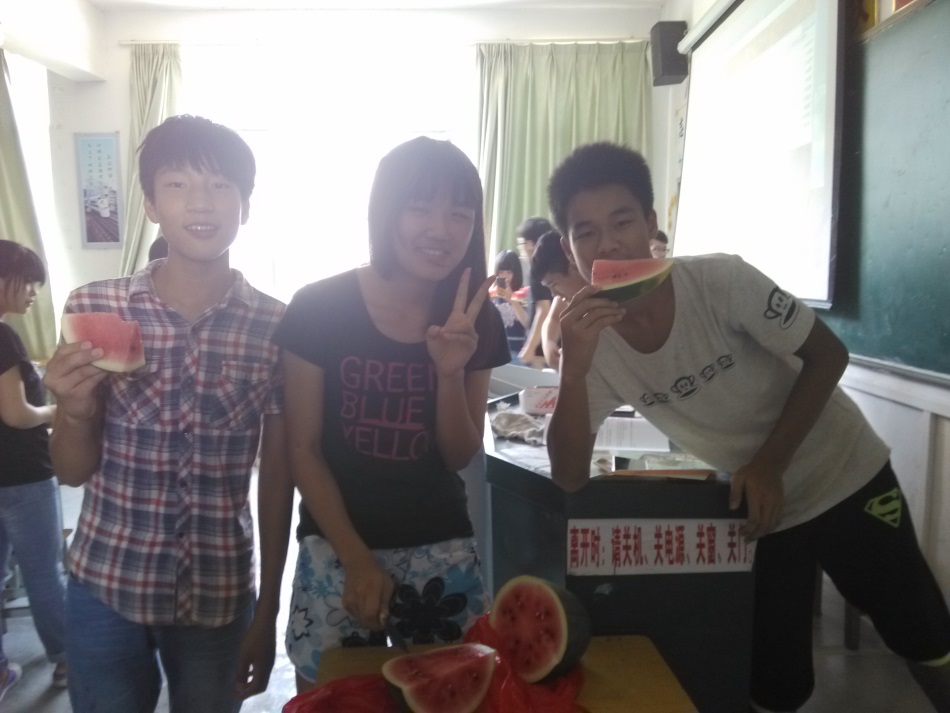 辛勤的老师们用午休时间把考卷都评出来了,有人欢喜有人愁?可不,初二(1)chaser班已经high翻全场了,今天是班里最得女老师女同学欢心的班草潘帅的生日!全班七位老师汇聚庆生现场,带领着chasers给寿星唱了四种语言的生日歌,最新颖的曲式是我们的袁博老师昨天在百科课上教的韩语,学以致用!唱歌吃西瓜玩游戏,我们设计的“谁是卧底”游戏深得同学们的喜欢,卧底虽然“深藏不漏”,但还是敌不过平民们的聪明智慧。