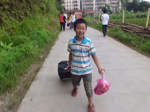 29日早晨,员工早早就起了床。当多数队员带着行李走出宿舍楼梯,前往食堂最后一餐时,已经有不少员工聚集在宿舍楼下。这里没有酒,也没有茶水,就让相机的镜头留下这一刻,记下你的面孔。此时虽说眼泪很争气,没有掉下来,但师生心境已经是万分心酸。在送别的员工当中,有一个小学班的名叫李想的小男孩,课堂上他十分活跃,可爱的笑脸机灵的眼神,加上他童稚而又尖锐的嗓子,服务队队员无不对他喜爱有加。今早,他特地来为大哥大姐送行。“让我来背背书包,让我来拉(行李箱),我不能没背东西。”队伍动身前往大道等候大巴时,他对着拿着大包小包行李的队员说。背包沉重,行李箱几乎高过他的个头,但这小家伙,本着我能为你做些什么的理念,深深感动着每一个人。